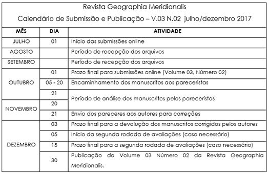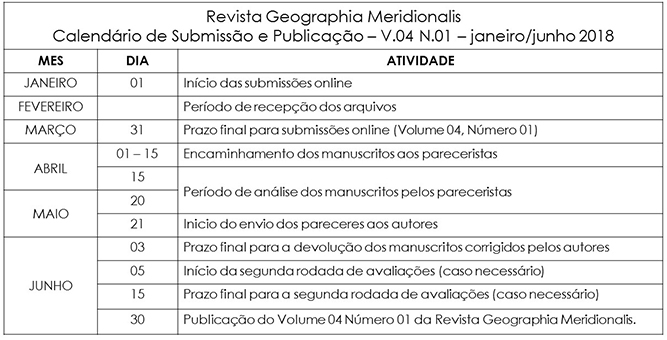 Atualmente a plataforma OJS UFPEL não tem tido compatibilidade com endereços de e-mail que não sejam institucionais. Assim, solicitamos a todas/os as/os novos inscritos na plataforma que efetuem o cadastro, se possível, com e-mail institucional. Maiores erros estão sendo verificados especialmente com e-mails cujo provedor é gmail. Em caso de dificuldades no acesso à revista, entrem contato com geomeridionalis@ufpel.edu.br ou alex.serrano@ufpel.edu.br