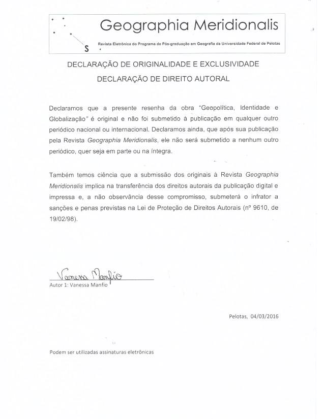 Manfio, V. (2016). GEOPOLÍTICA, IDENTIDADE E GLOBALIZAÇÃO. Geographia Meridionalis, 2(1), 165-169. https://doi.org/10.15210/gm.v2i1.7789