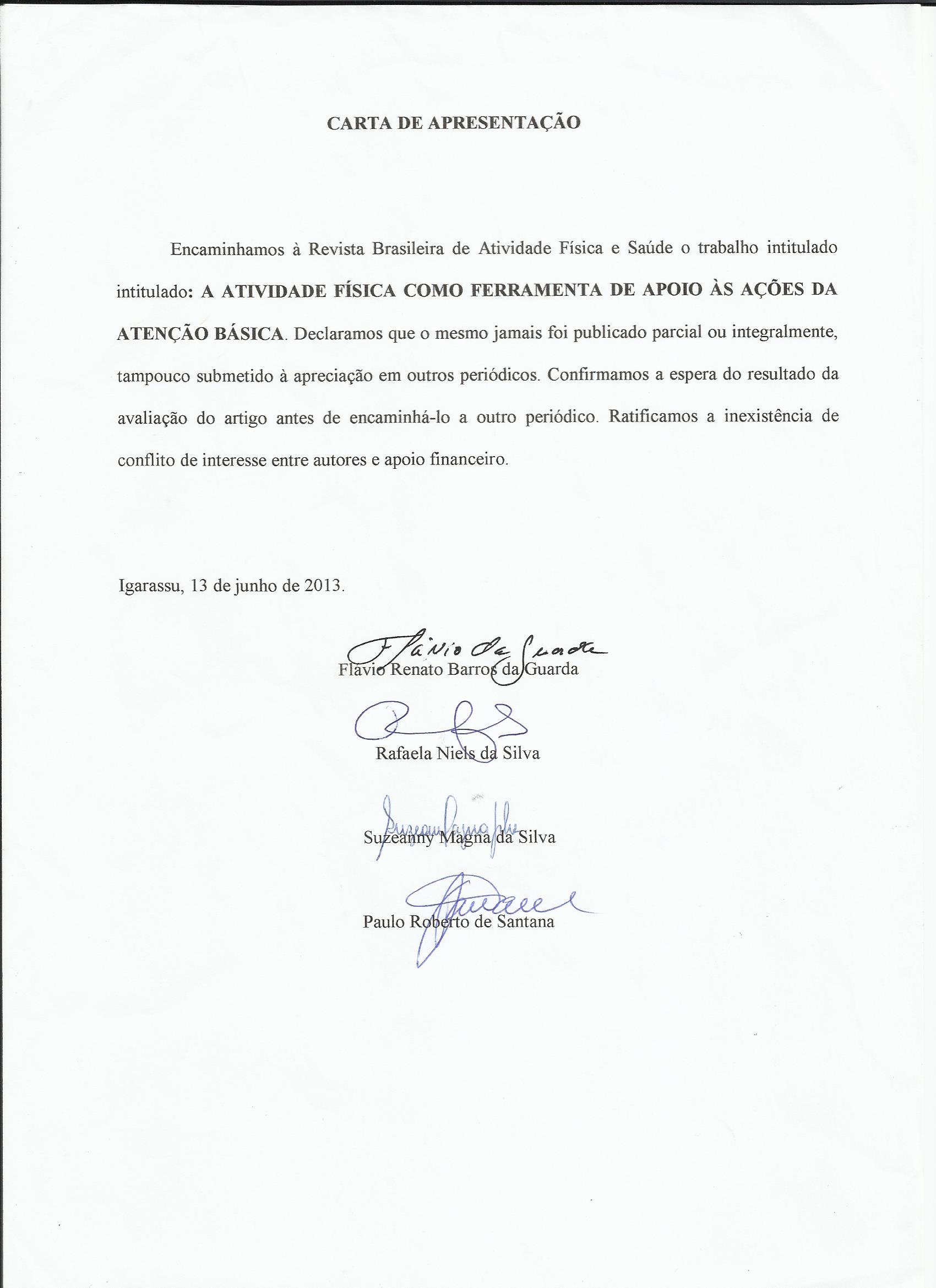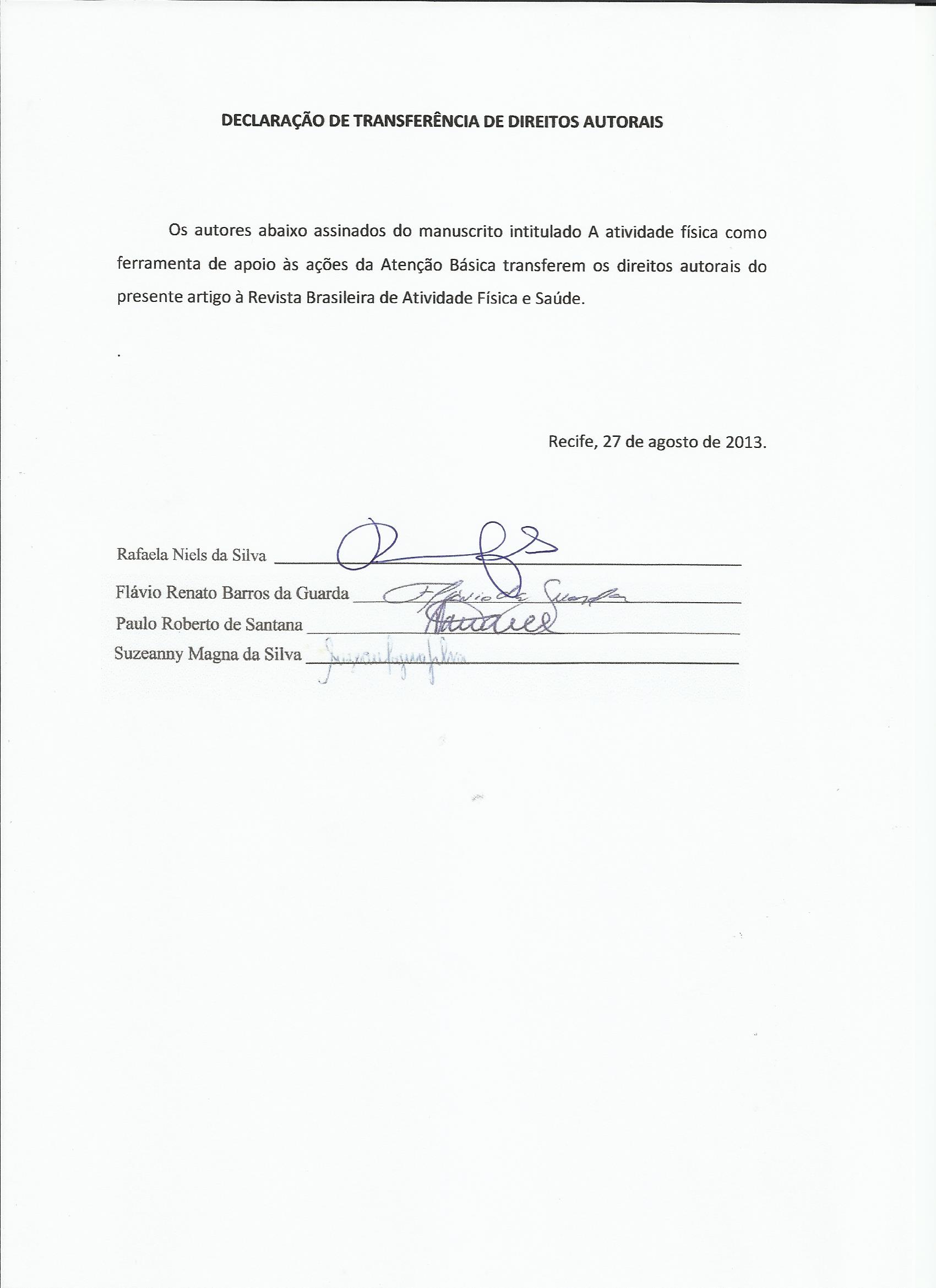 Os autores deverão encaminhar no momento da submissão, a declaração de transferência de direitos autorais assinada. Esta declaração deverá ser preparada em conformidade com o modelo fornecido pela revista. Artigos aceitos para publicação passam a ser propriedade da revista, não podendo ser reproduzidos, mesmo que de forma parcial, incluindo a tradução para outro idioma, sem a autorização por escrito da Revista Brasileira de Atividade Física e Saúde.