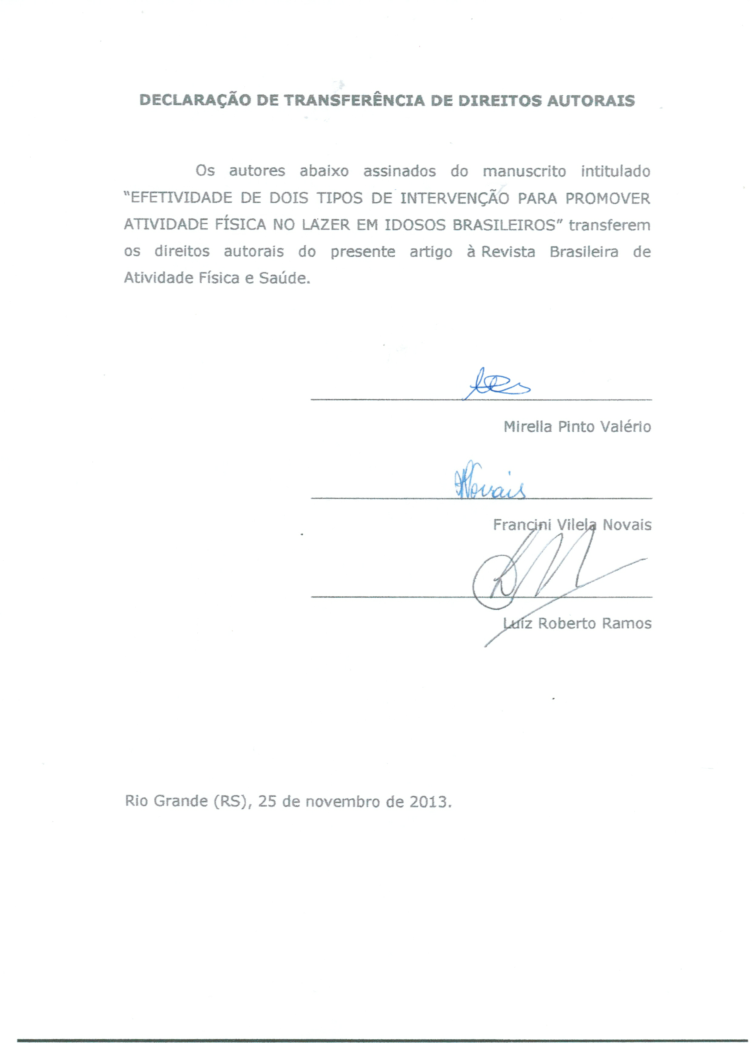 Os autores deverão encaminhar no momento da submissão, a declaração de transferência de direitos autorais assinada. Esta declaração deverá ser preparada em conformidade com o modelo fornecido pela revista. Artigos aceitos para publicação passam a ser propriedade da revista, não podendo ser reproduzidos, mesmo que de forma parcial, incluindo a tradução para outro idioma, sem a autorização por escrito da Revista Brasileira de Atividade Física e Saúde.
