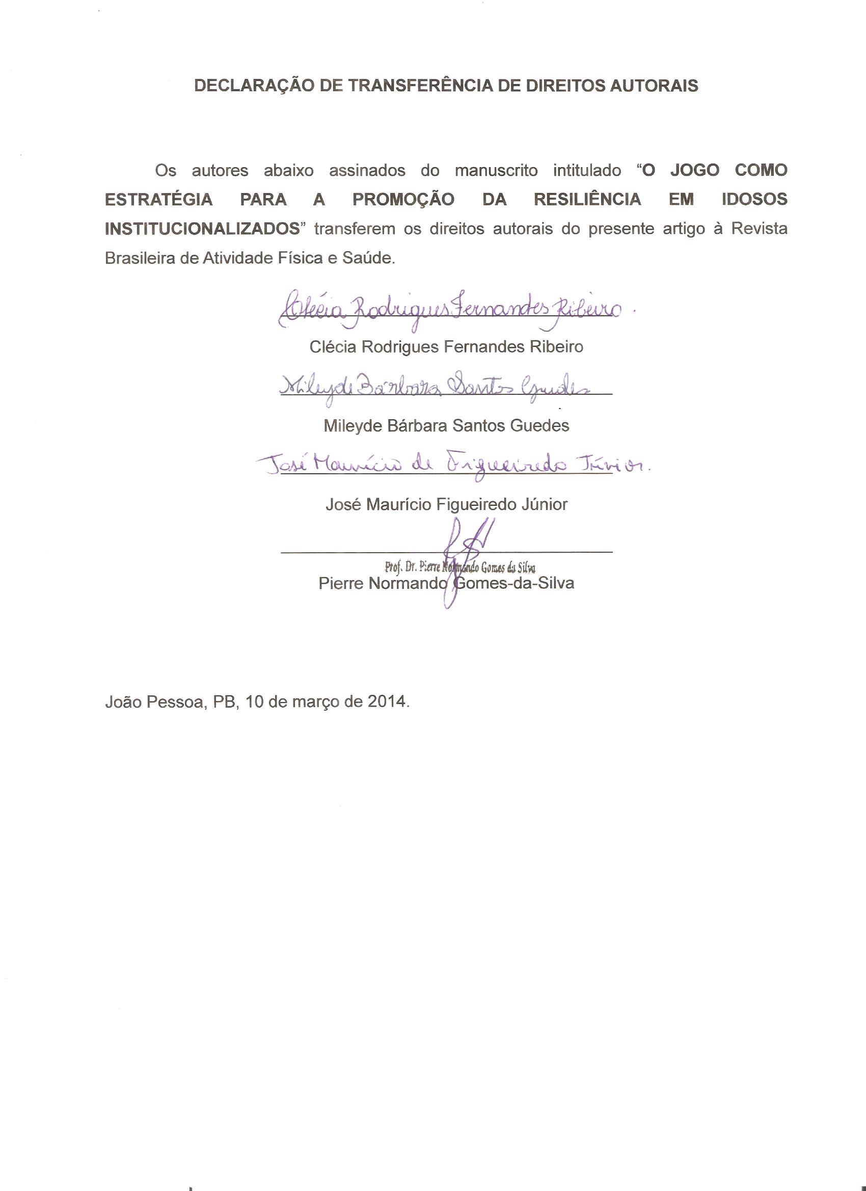 Os autores deverão encaminhar no momento da submissão, a declaração de transferência de direitos autorais assinada. Esta declaração deverá ser preparada em conformidade com o modelo fornecido pela revista. Artigos aceitos para publicação passam a ser propriedade da revista, não podendo ser reproduzidos, mesmo que de forma parcial, incluindo a tradução para outro idioma, sem a autorização por escrito da Revista Brasileira de Atividade Física e Saúde.
