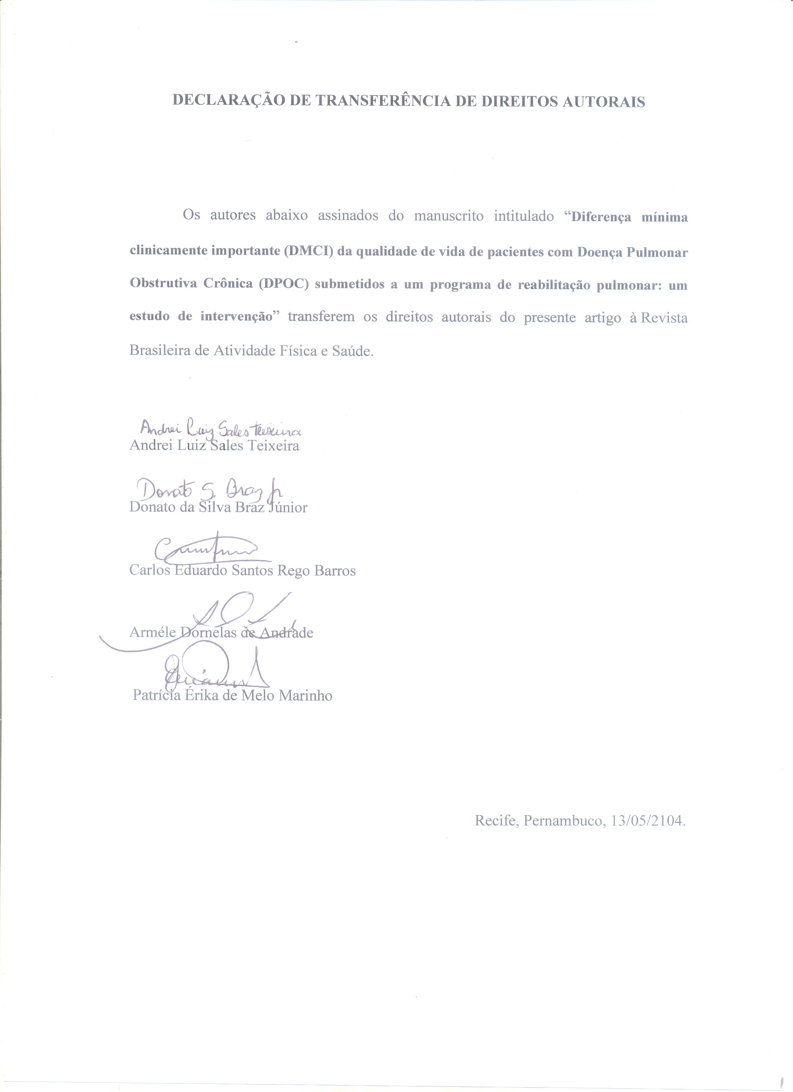 Os autores deverão encaminhar no momento da submissão, a declaração de transferência de direitos autorais assinada. Esta declaração deverá ser preparada em conformidade com o modelo fornecido pela revista. Artigos aceitos para publicação passam a ser propriedade da revista, não podendo ser reproduzidos, mesmo que de forma parcial, incluindo a tradução para outro idioma, sem a autorização por escrito da Revista Brasileira de Atividade Física e Saúde.