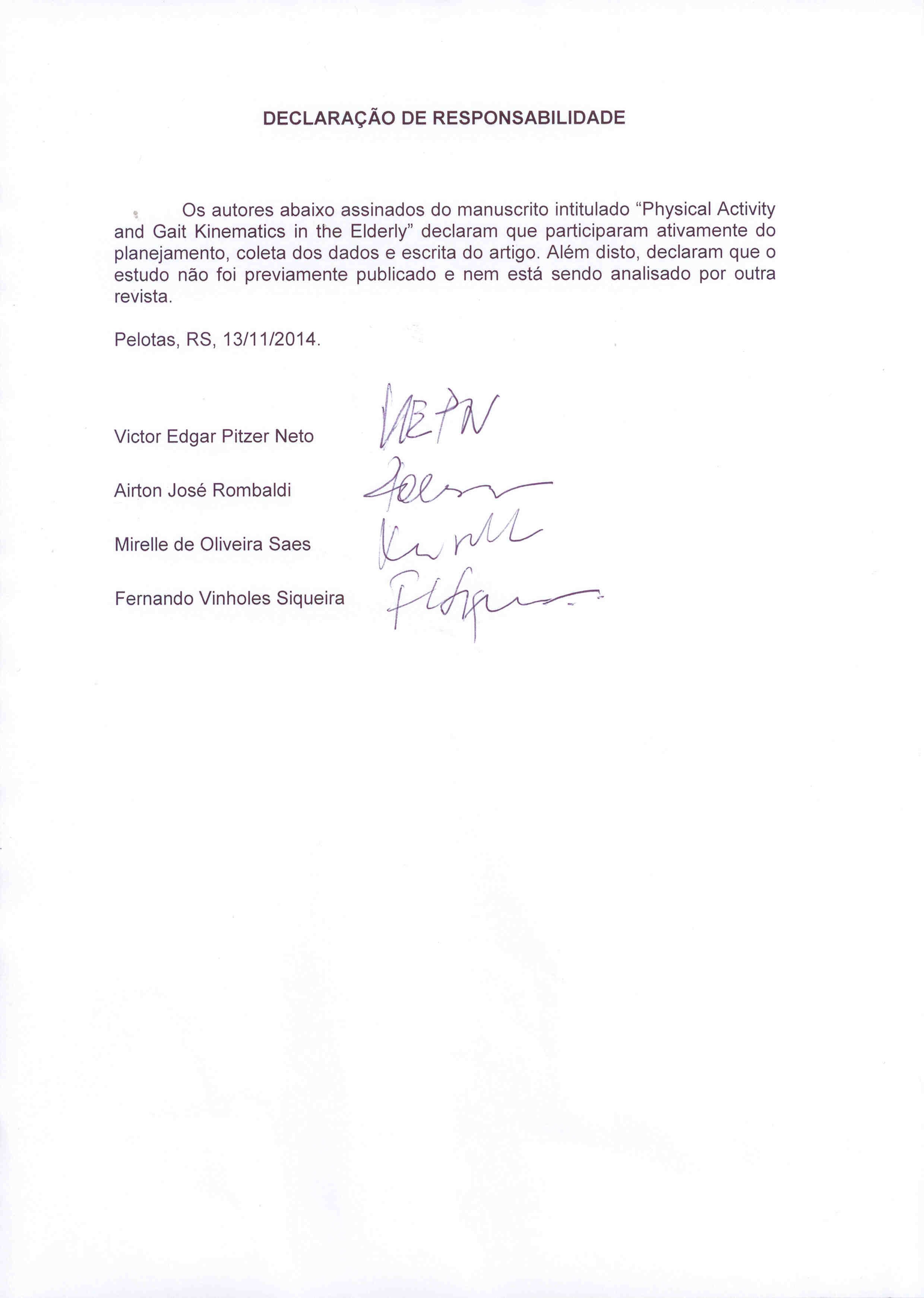 The paper proposed to analyze the gait kinematics of different physical activity levels. A cross-sectional study, with 60 seniors, divided according to level of physical activity into groups of active, insufficiently active and inactive seniors. The kinematic parameters investigated in gait were stride length, gait speed, distance between the ground and the hallux and the angles of the hip, knee and ankle. Kinovea 0.8 and ImageJ were used for photogrammetric data analysis and STATA 9.2 was used for statistical analysis. Average stride length, gait speed and distance between the hallux and the ground were significantly higher among physically active seniors. As for the ankle joint angle, during the gait phase referred to as toe-off, the angle was greater in the active group (82.98, SD 5.96) compared with the inactive group (86.05, SD 5.44) (p=0.025). Average knee joint angles in degrees during the toe-off phase were 151.02 (SD 10.03) in the active group, 151.12 (SD 7.79) in the insufficiently active and 143.35 (SD 7.08) (p= 0.006) in inactive group. In the acceleration phase the results were 126.81 (SD 7.26), 123.81 (6.60) and 130.4 (6.94) in each group (p=0.015), respectively. Our findings demonstrated that physical activity is important to reduce changes to gait caused by the natural aging process. Physical activity should therefore be widely encouraged among the elderly as a preventive and health promotion in measure this population.Downloads