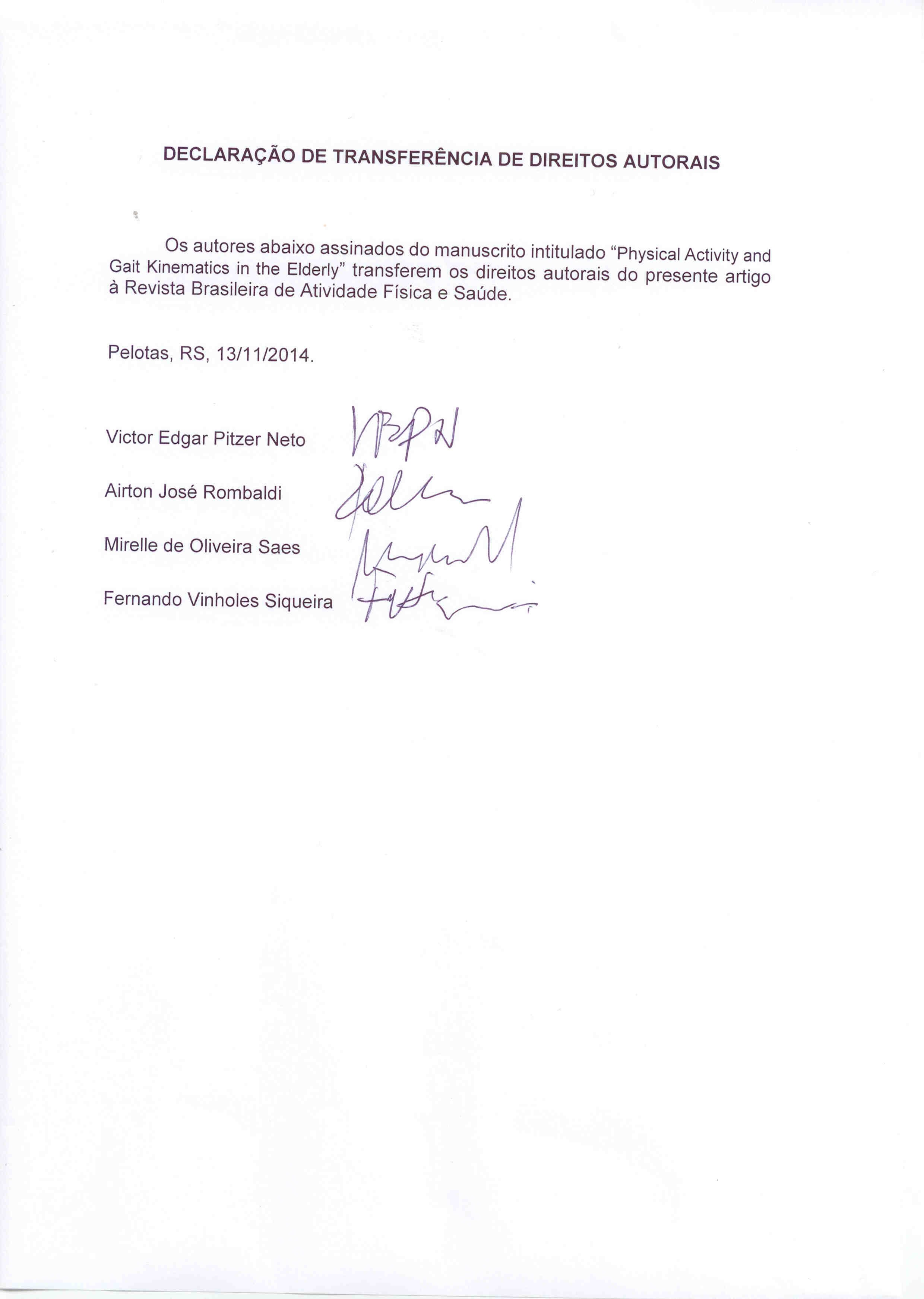 Os autores deverão encaminhar no momento da submissão, a declaração de transferência de direitos autorais assinada. Esta declaração deverá ser preparada em conformidade com o modelo fornecido pela revista. Artigos aceitos para publicação passam a ser propriedade da revista, não podendo ser reproduzidos, mesmo que de forma parcial, incluindo a tradução para outro idioma, sem a autorização por escrito da Revista Brasileira de Atividade Física e Saúde.