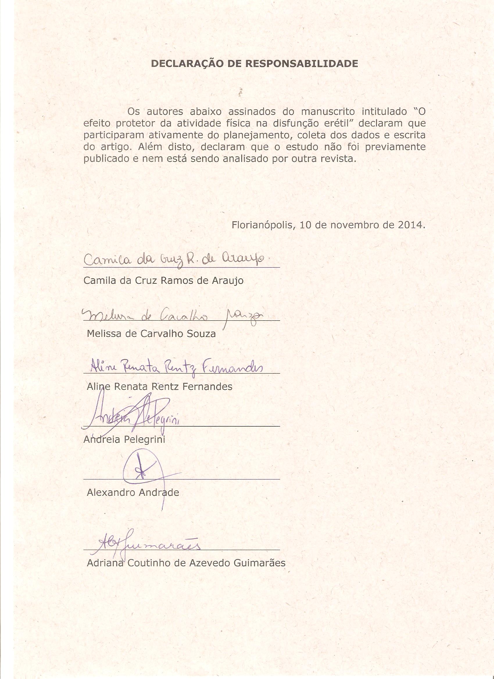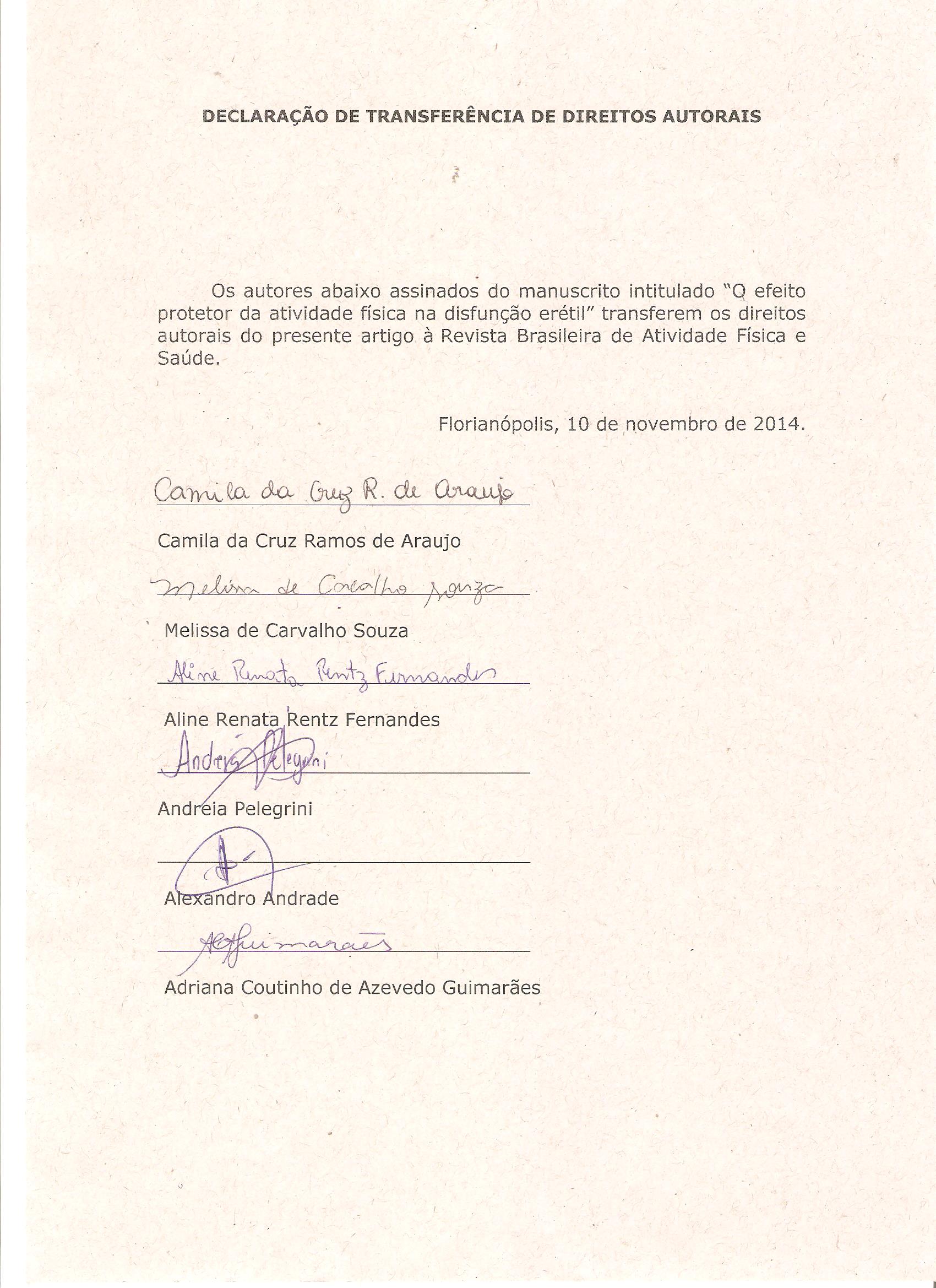 Os autores deverão encaminhar no momento da submissão, a declaração de transferência de direitos autorais assinada. Esta declaração deverá ser preparada em conformidade com o modelo fornecido pela revista. Artigos aceitos para publicação passam a ser propriedade da revista, não podendo ser reproduzidos, mesmo que de forma parcial, incluindo a tradução para outro idioma, sem a autorização por escrito da Revista Brasileira de Atividade Física e Saúde.