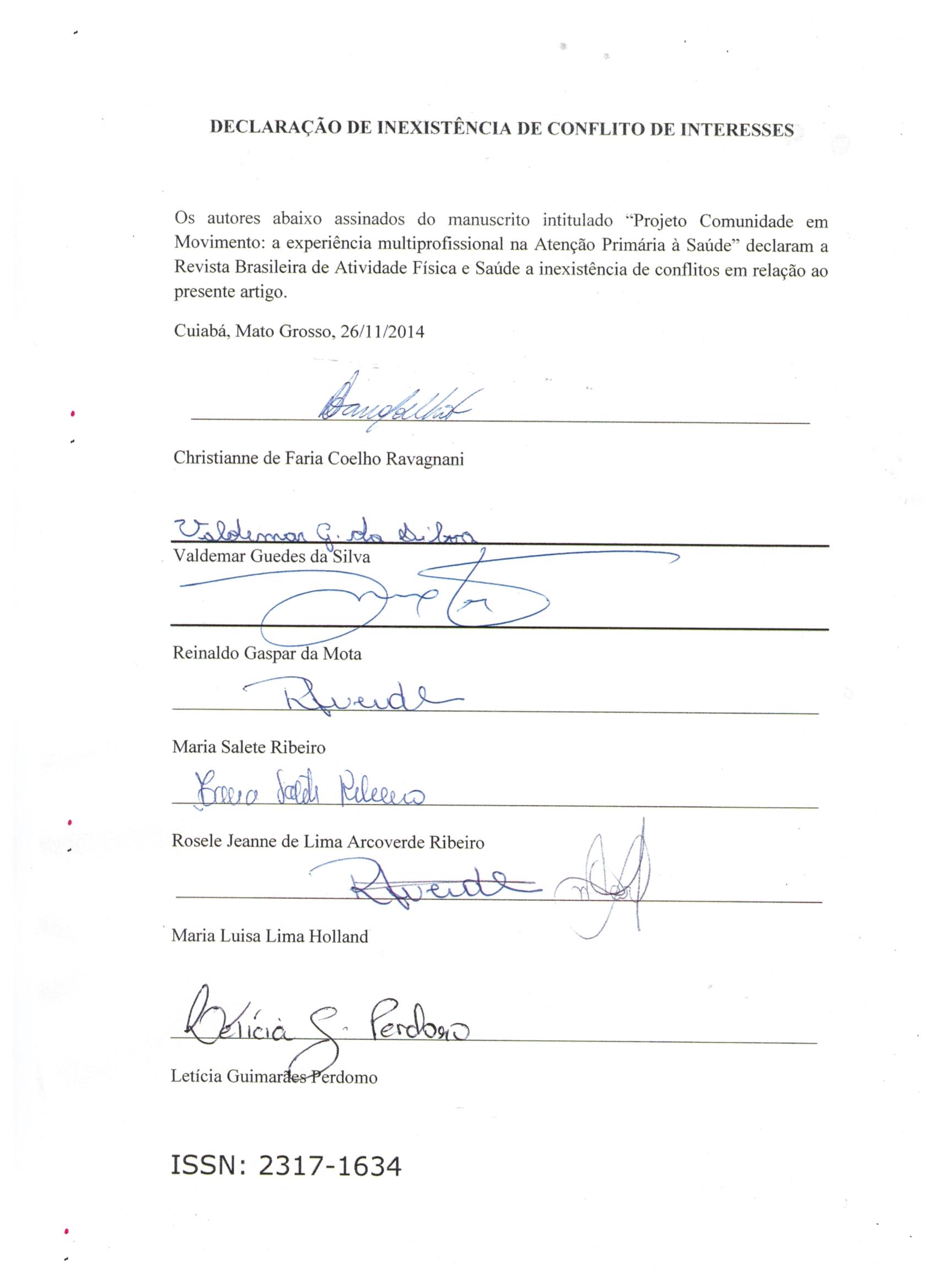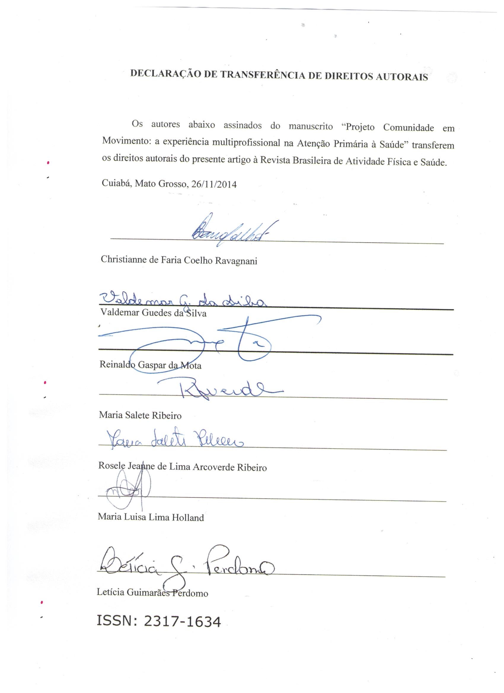 Os autores deverão encaminhar no momento da submissão, a declaração de transferência de direitos autorais assinada. Esta declaração deverá ser preparada em conformidade com o modelo fornecido pela revista. Artigos aceitos para publicação passam a ser propriedade da revista, não podendo ser reproduzidos, mesmo que de forma parcial, incluindo a tradução para outro idioma, sem a autorização por escrito da Revista Brasileira de Atividade Física e Saúde.