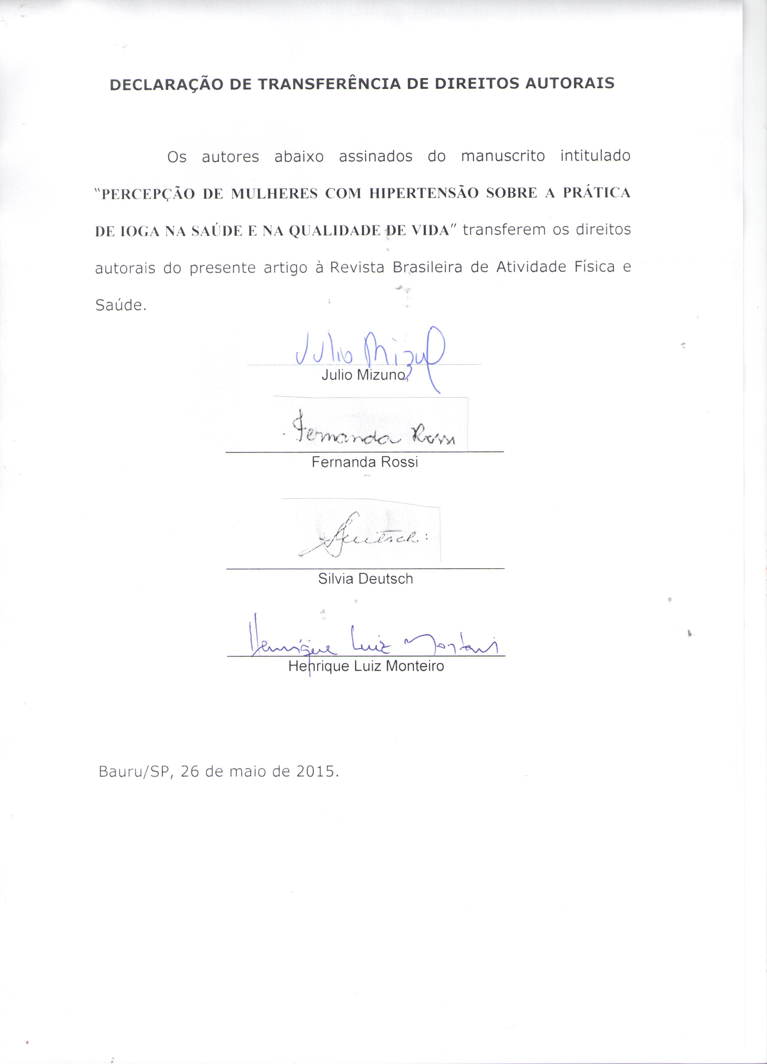 Os autores deverão encaminhar no momento da submissão, a declaração de transferência de direitos autorais assinada. Esta declaração deverá ser preparada em conformidade com o modelo fornecido pela revista. Artigos aceitos para publicação passam a ser propriedade da revista, não podendo ser reproduzidos, mesmo que de forma parcial, incluindo a tradução para outro idioma, sem a autorização por escrito da Revista Brasileira de Atividade Física e Saúde.