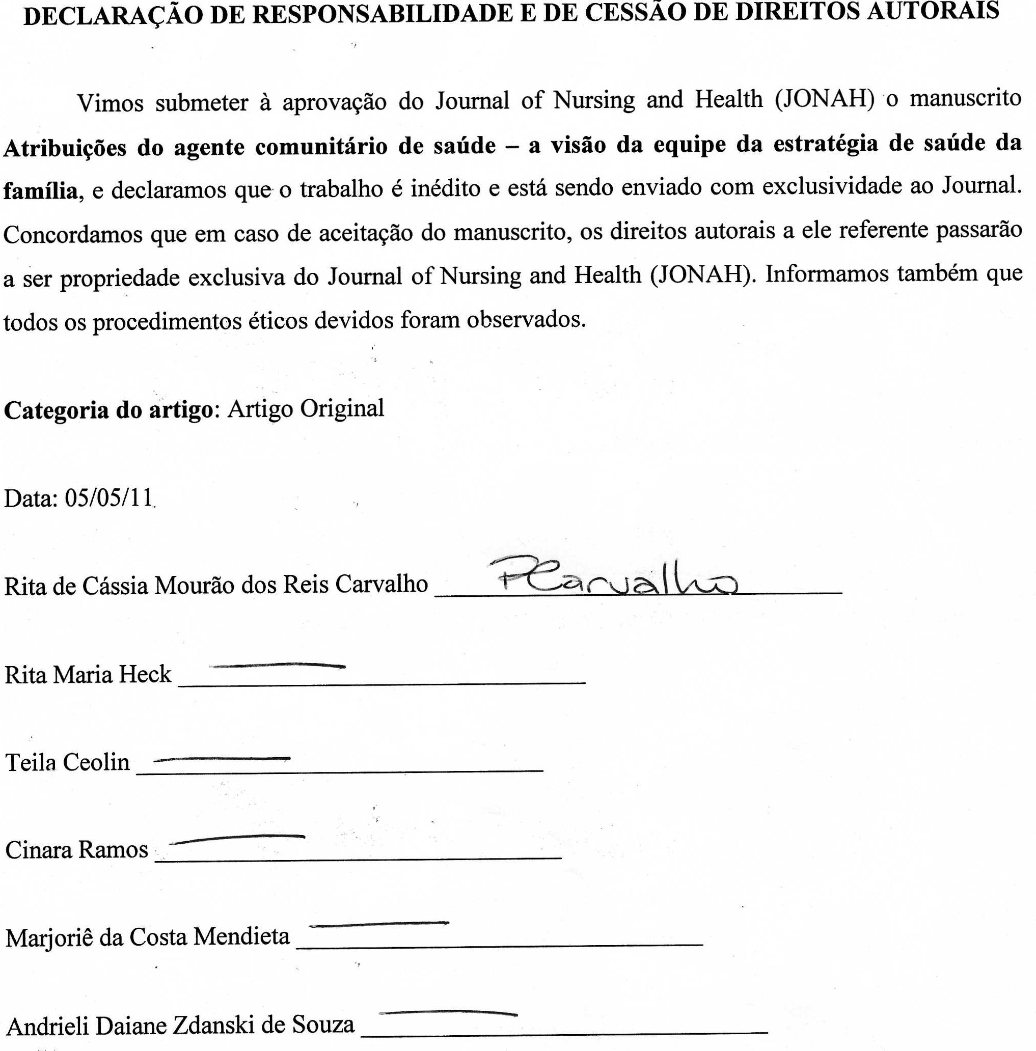 Submetemos à aprovação do Journal of Nursing and Health (JONAH) o manuscrito "TÍTULO (máximo 15 palavras)", e declaramos que o trabalho é inédito, original e está sendo enviado com exclusividade ao Journal.