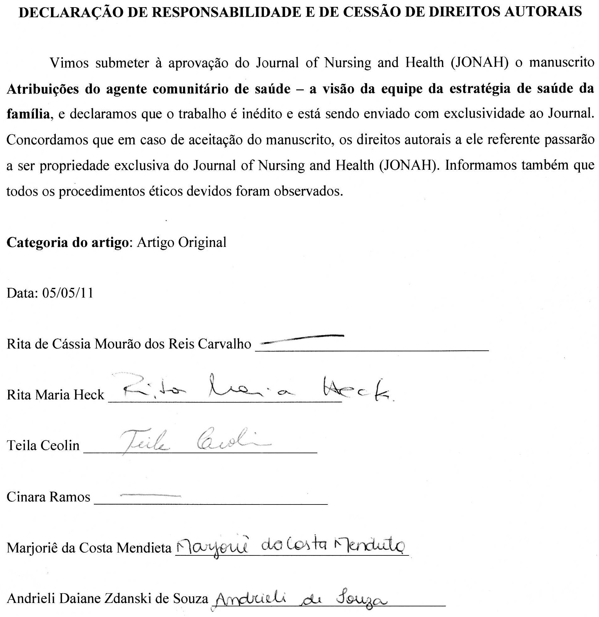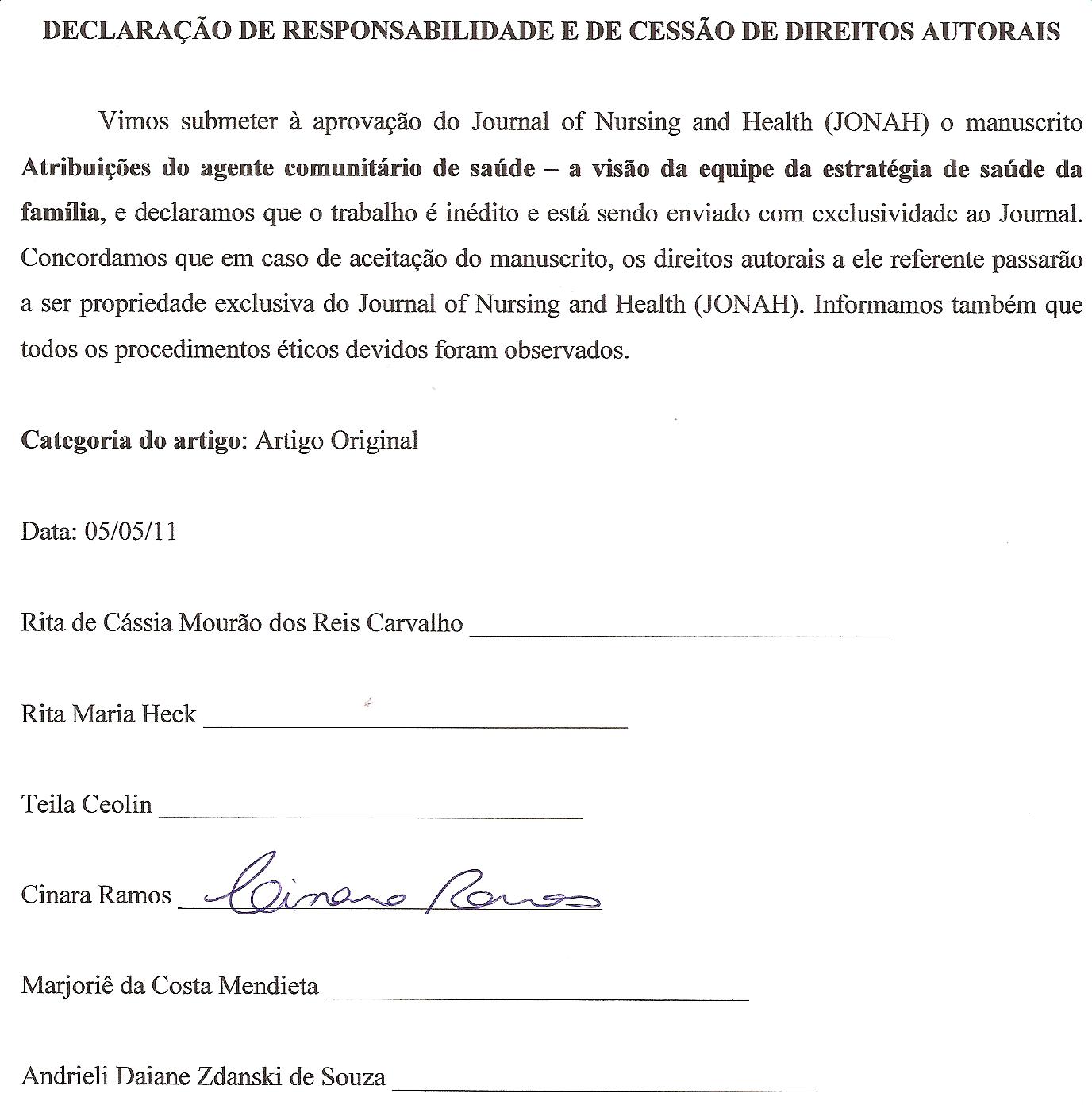 Concordamos que em caso de aceitação do manuscrito, os direitos autorais a ele referente passarão a ser propriedade exclusiva do Journal of Nursing and Health (JONAH), sob licença Creative Commons 4.0 e com a divulgação do artigo em mídias sociais da Revista.