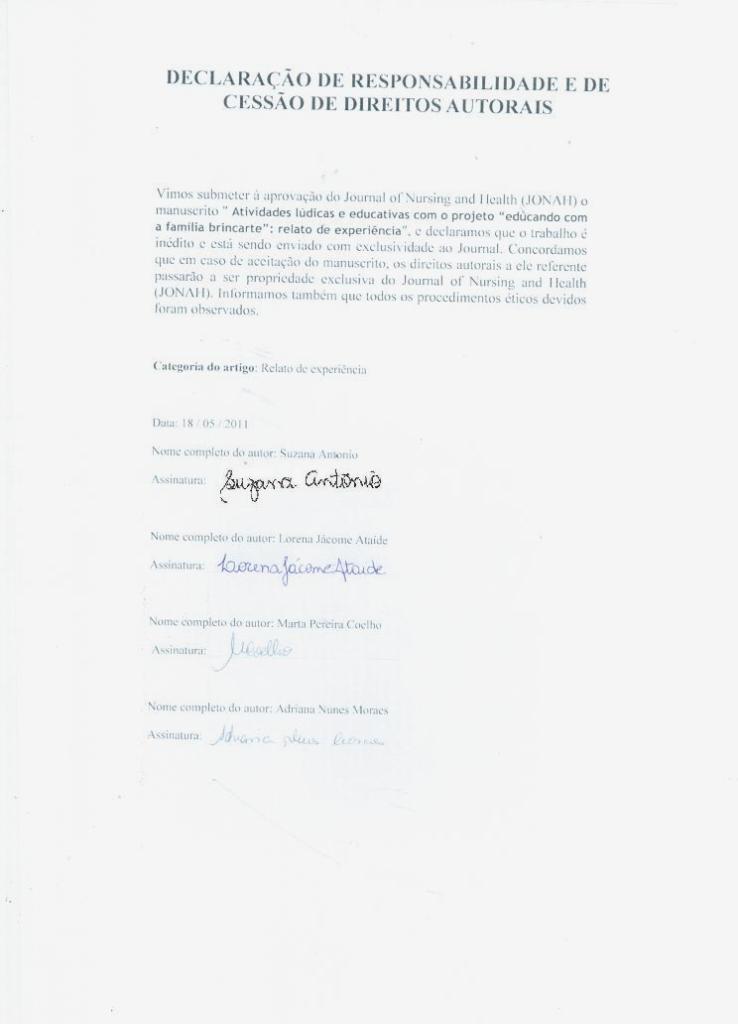 Submetemos à aprovação do Journal of Nursing and Health (JONAH) o manuscrito "TÍTULO (máximo 15 palavras)", e declaramos que o trabalho é inédito, original e está sendo enviado com exclusividade ao Journal.