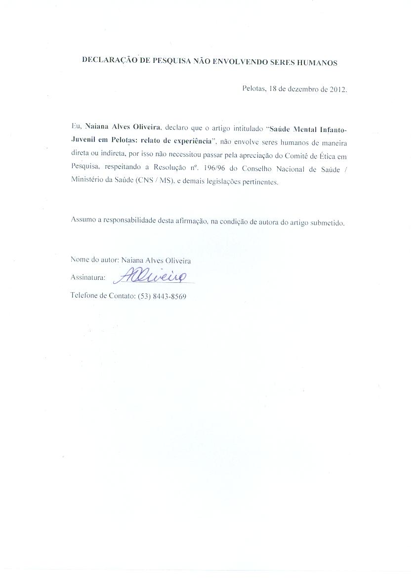 Informamos igualmente que todos os procedimentos éticos devidos foram observados, não infringindo nenhum copyright ou nenhum outro tipo de direito de propriedade de outras pessoas e todas as citações no texto são fatos verdadeiros ou baseados em pesquisa de exatidão científica.