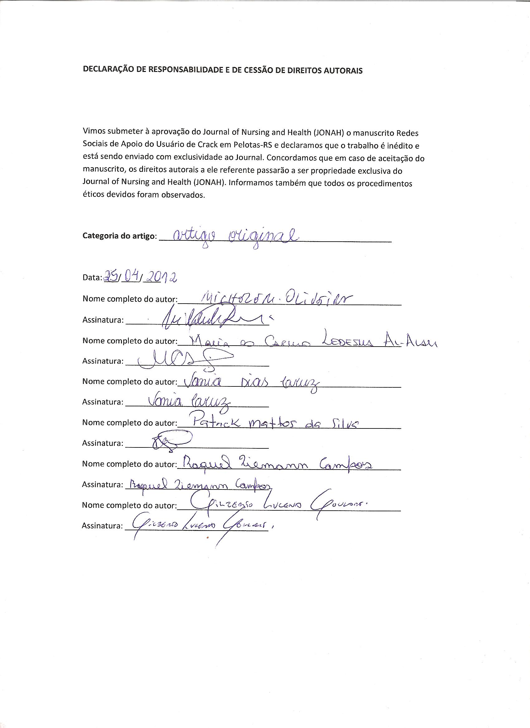 Concordamos que em caso de aceitação do manuscrito, os direitos autorais a ele referente passarão a ser propriedade exclusiva do Journal of Nursing and Health (JONAH), sob licença Creative Commons 4.0 e com a divulgação do artigo em mídias sociais da Revista.