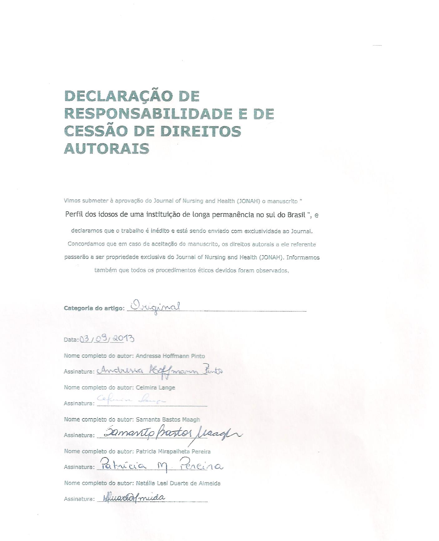 Submetemos à aprovação do Journal of Nursing and Health (JONAH) o manuscrito "TÍTULO (máximo 15 palavras)", e declaramos que o trabalho é inédito, original e está sendo enviado com exclusividade ao Journal.