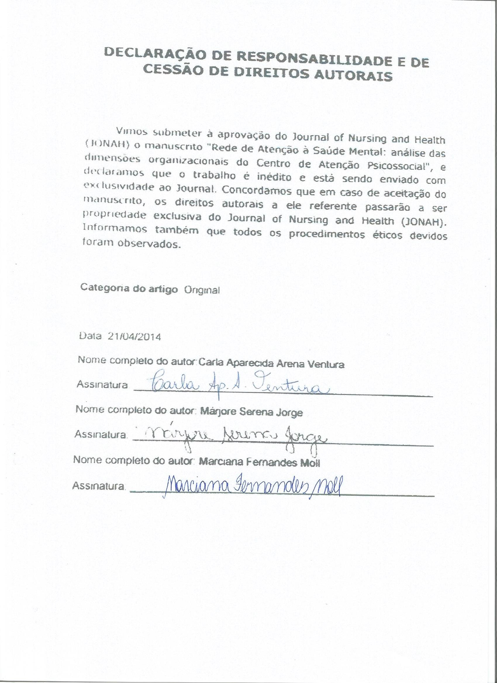 Concordamos que em caso de aceitação do manuscrito, os direitos autorais a ele referente passarão a ser propriedade exclusiva do Journal of Nursing and Health (JONAH), sob licença Creative Commons 4.0 e com a divulgação do artigo em mídias sociais da Revista.