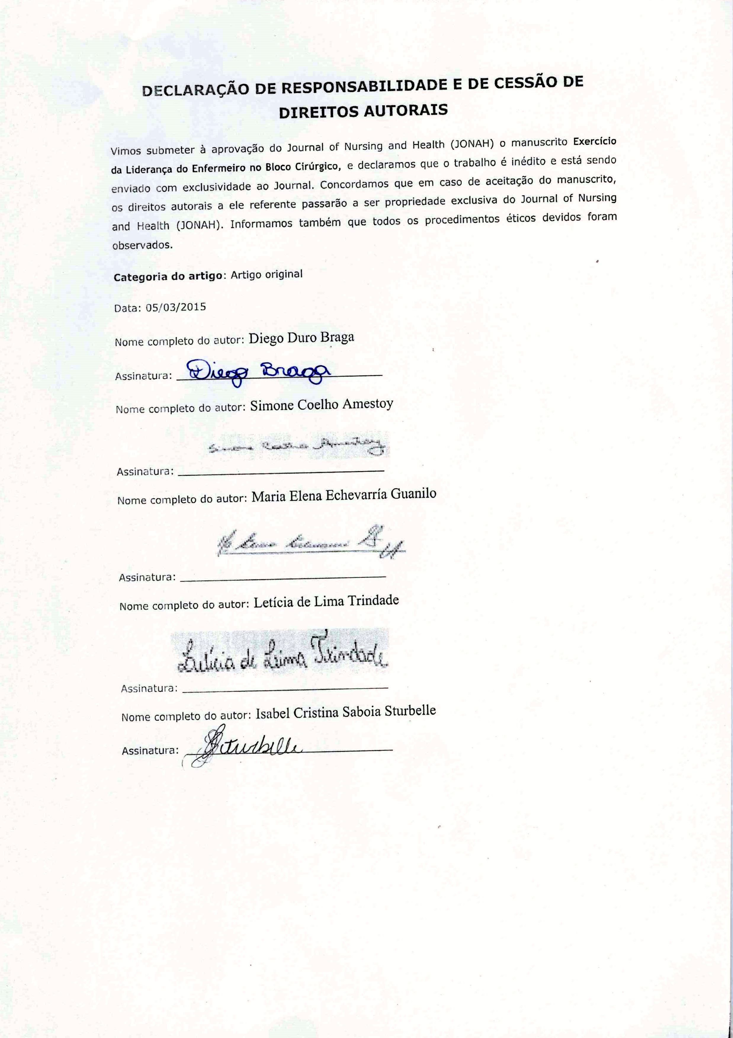 Concordamos que em caso de aceitação do manuscrito, os direitos autorais a ele referente passarão a ser propriedade exclusiva do Journal of Nursing and Health (JONAH), sob licença Creative Commons 4.0 e com a divulgação do artigo em mídias sociais da Revista.