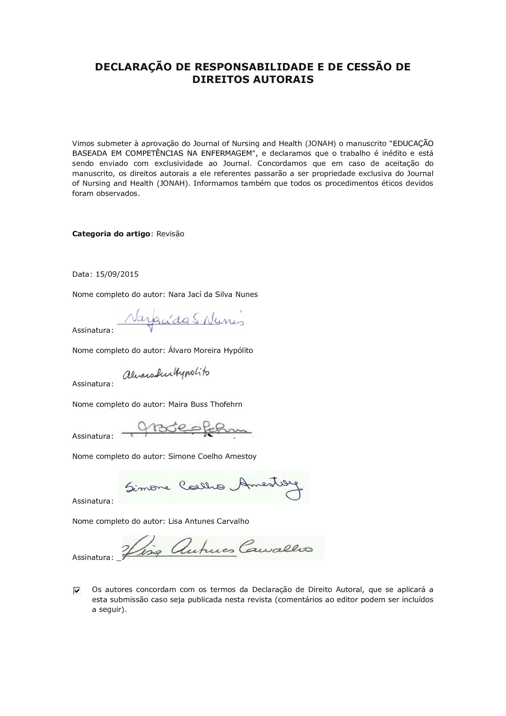Submetemos à aprovação do Journal of Nursing and Health (JONAH) o manuscrito "TÍTULO (máximo 15 palavras)", e declaramos que o trabalho é inédito, original e está sendo enviado com exclusividade ao Journal.