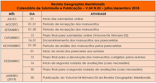 Atualmente a plataforma OJS UFPEL não tem tido compatibilidade com endereços de e-mail que não sejam institucionais. Assim, solicitamos a todas/os as/os novos inscritos na plataforma que efetuem o cadastro, se possível, com e-mail institucional. Maiores erros estão sendo verificados especialmente com e-mails cujo provedor é gmail. Em caso de dificuldades no acesso à revista, entrem contato com geomeridionalis@ufpel.edu.br ou alex.serrano@ufpel.edu.br
